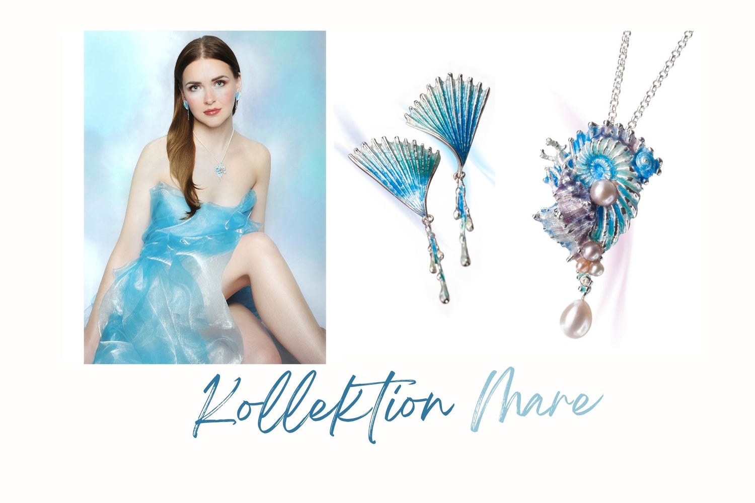 Die Meereszauber-Preziosen aus Meisterhand sind eine Hommage an die unendlichen Weiten des Meeres und die faszinierende Unterwasserwelt. Dem Ort, an dem Stille und Schönheit herrschen. Opulent und dennoch sehr filigran gearbeitet, frisch mit liebevollen Details: winzige Muscheln, ein Seepferdchen, das sich als scheues kleines Detail erst auf den zweiten Blick zu erkennen gibt, Korallen, Ammoniten sowie verschiedene Blautöne.