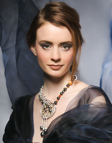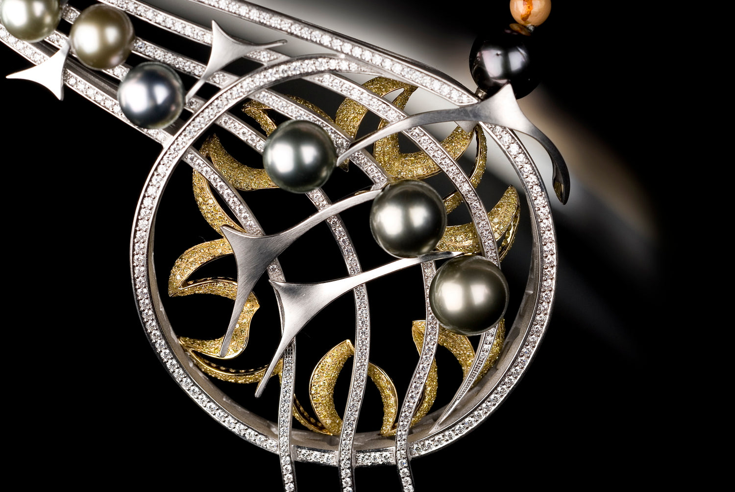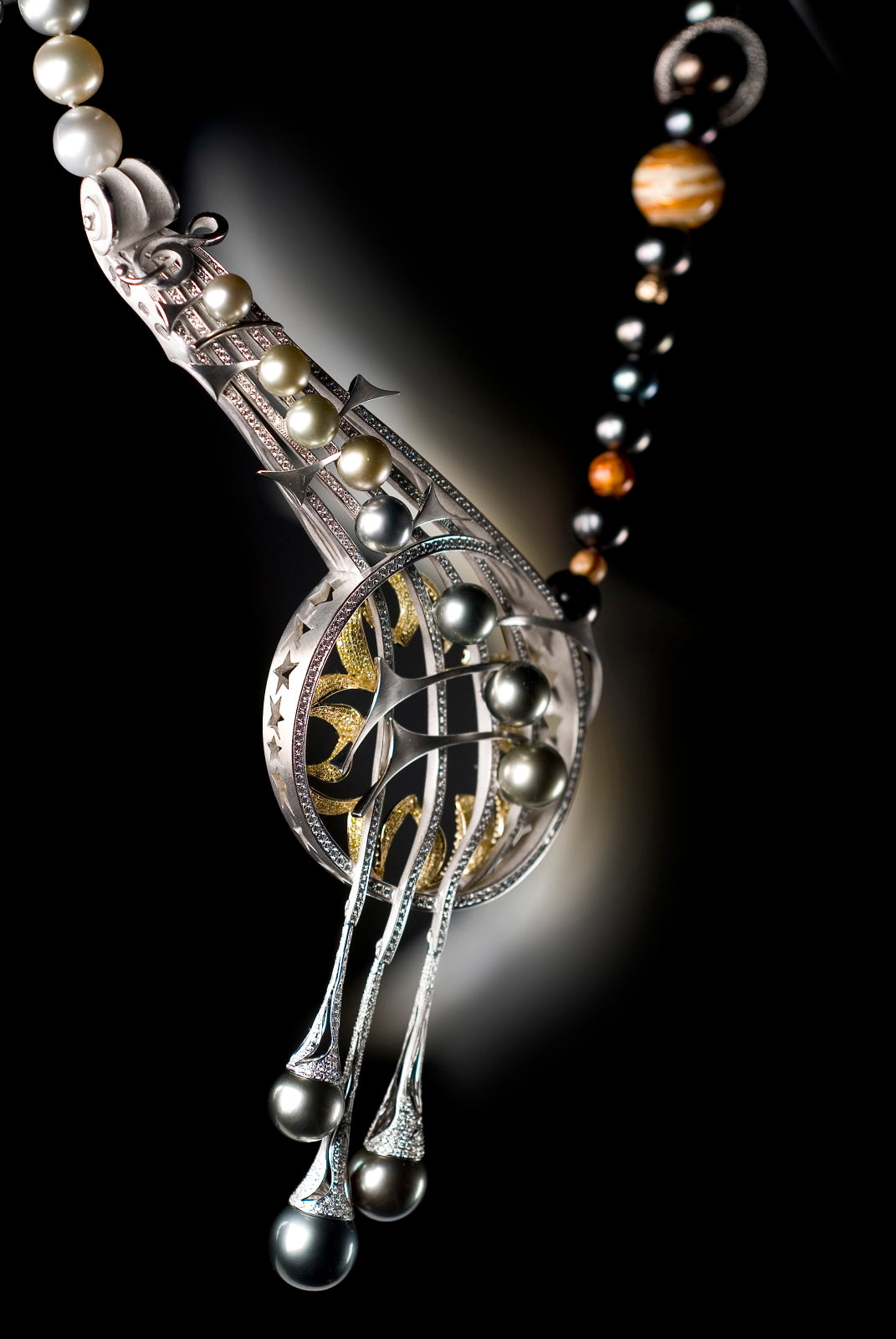 Die Anthrazitfärbung der jeweils zwischen den Planeten integrierten Tahitiperlensymbolisiert die unendliche Dunkelheit des Weltalls.