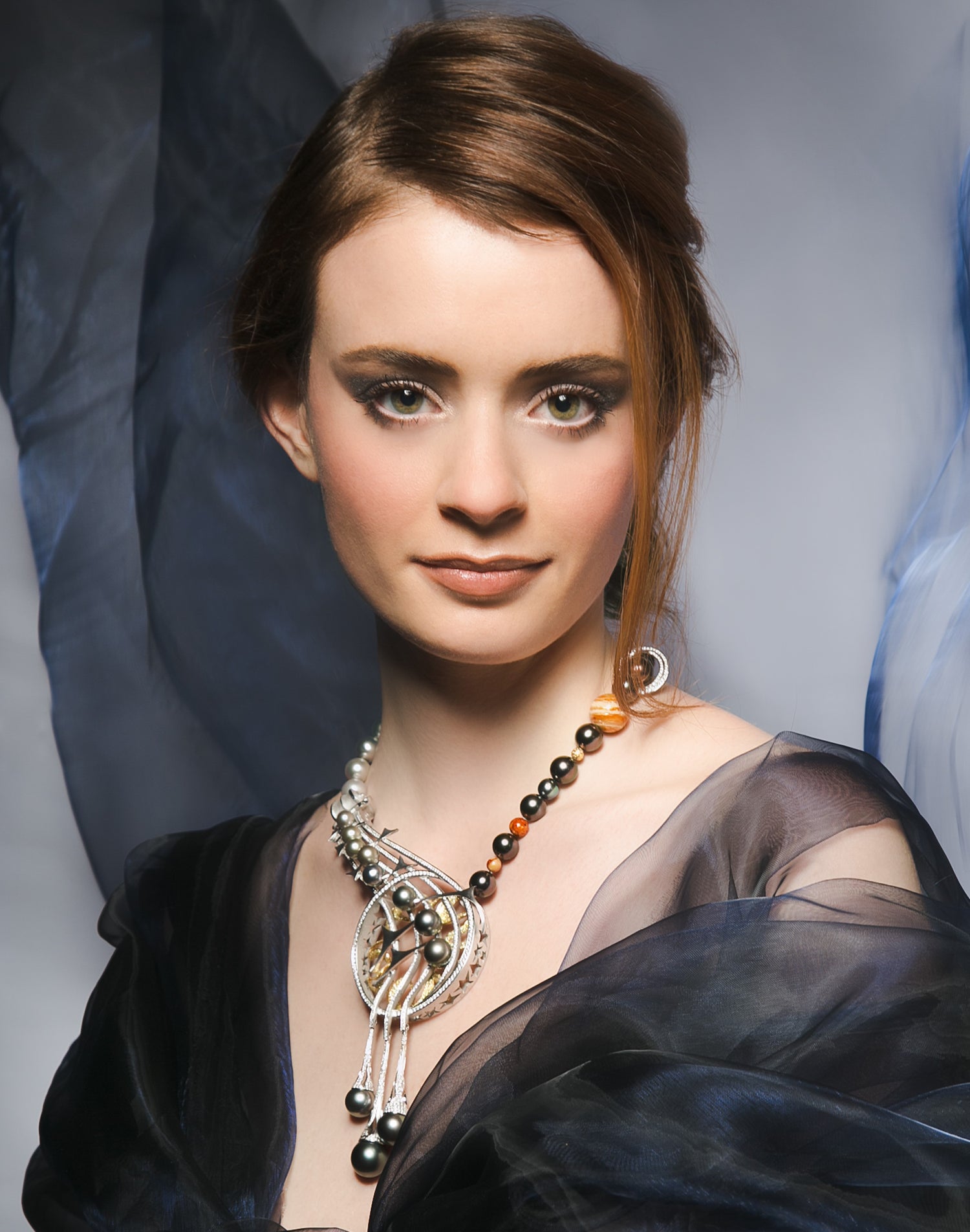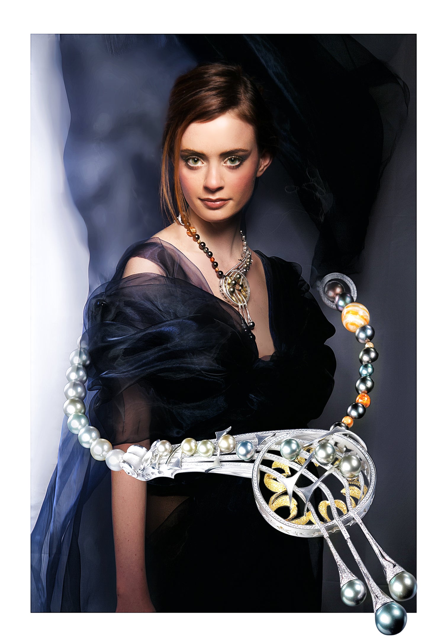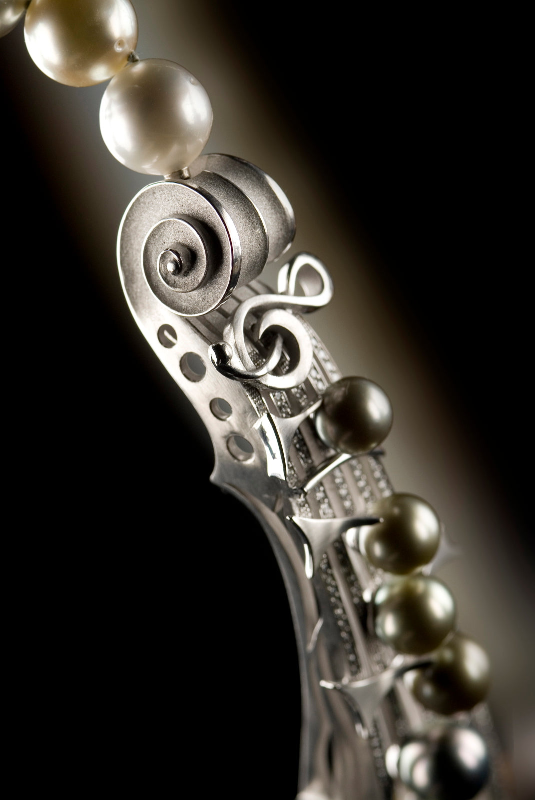 Der Melodie folgend, exakt nachempfunden durch die Positionierung von acht Tahitiperlenauf Notenlinien, entspringen drei unterschiedlich lange, tropfenförmige Elemente. Deren Enden gewähren als herabfallende Sternschnuppen tiefe Einblicke in das Dekolletee der Trägerin.