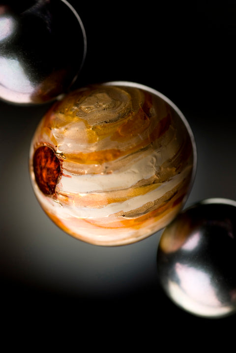 Eine besonders schöne Tahitiperle stellt die Erde im Collier Universo dar: Zwischen Venus und dem roten Planeten Mars glänzt sie mit einer blaugrünen Oberfläche.