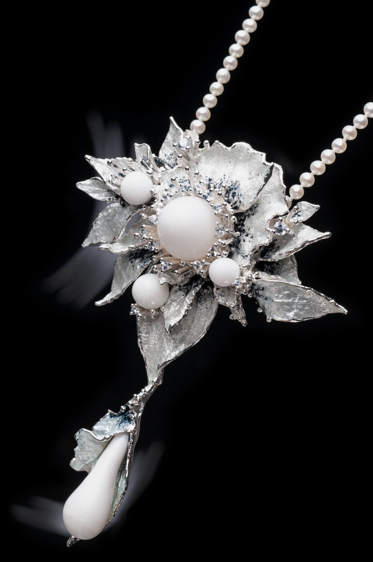 harmonisch in das Gesamtbild. Zwischen Sommer und Herbst strahlt die Sonne – symbolisiert durch einen gelben Citrin - noch einmal zu ihrer Höchstform auf. Im Nacken der Trägerin schließt sich der (Jahres-)Kreis und beginnt von neuem mit zarten, immer kräftiger werdenden roséfarbenen Blüten.
