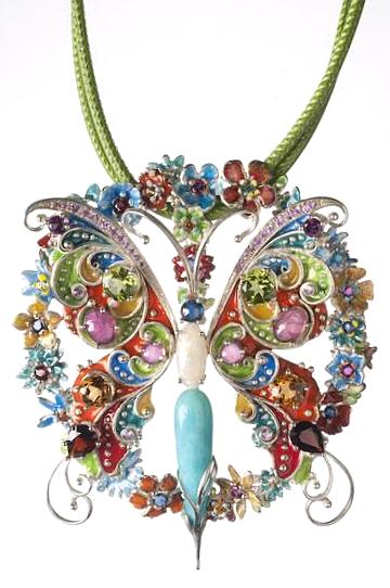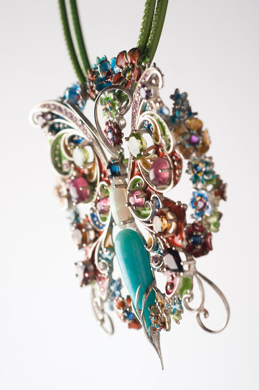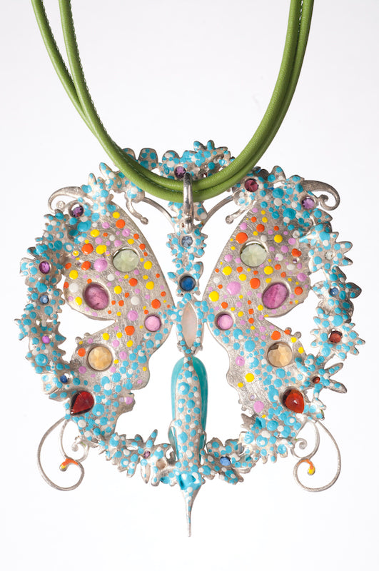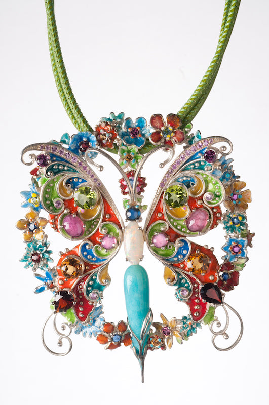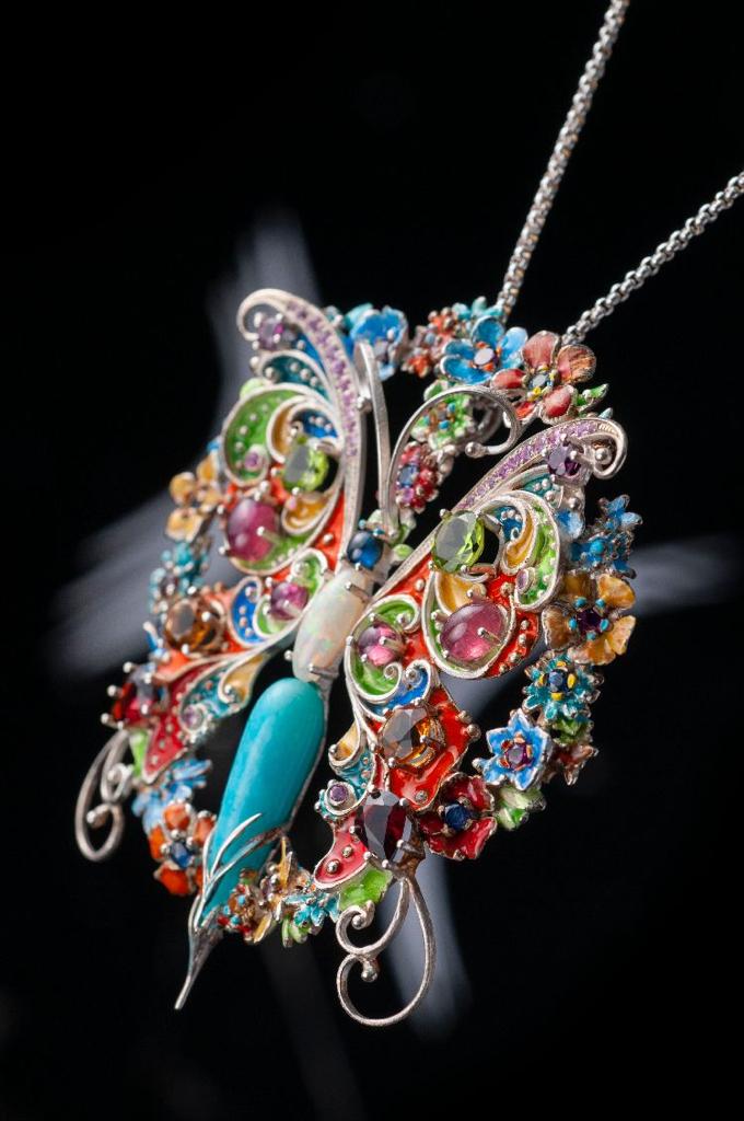 Das aus 925er-Silber gestaltete Schmuckstück ist mit 60 Edelsteinen in den verschiedensten Farben, Größen und Qualitäten ausgeschmückt.